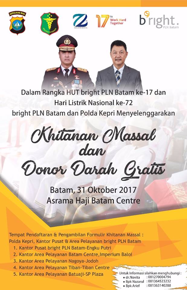 Dalam rangka memperingati Hari Ulang Tahun (HUT) bright PLN Batam ke – 17 dan Hari Listrik Nasional (HLN) ke – 72, bright PLN Batam kembali menyelenggarakan Khitanan Massal untuk anak yatim, kaum duafa dan masyarakat tidak mampu, sekaligus melaksanakan donor darah rutin. bright PLN Batam bekerjasama dengan Polda Kepri akan mengadakan kegiatan tersebut di Asrama Haji, Batam Center pada Selasa, 31 Oktober 2017, dari pukul 07.00 WIB sampai selesai. Program khitanan massal merupakan salah satu program sosial yang dilaksanakan rutin setiap tahunnya.