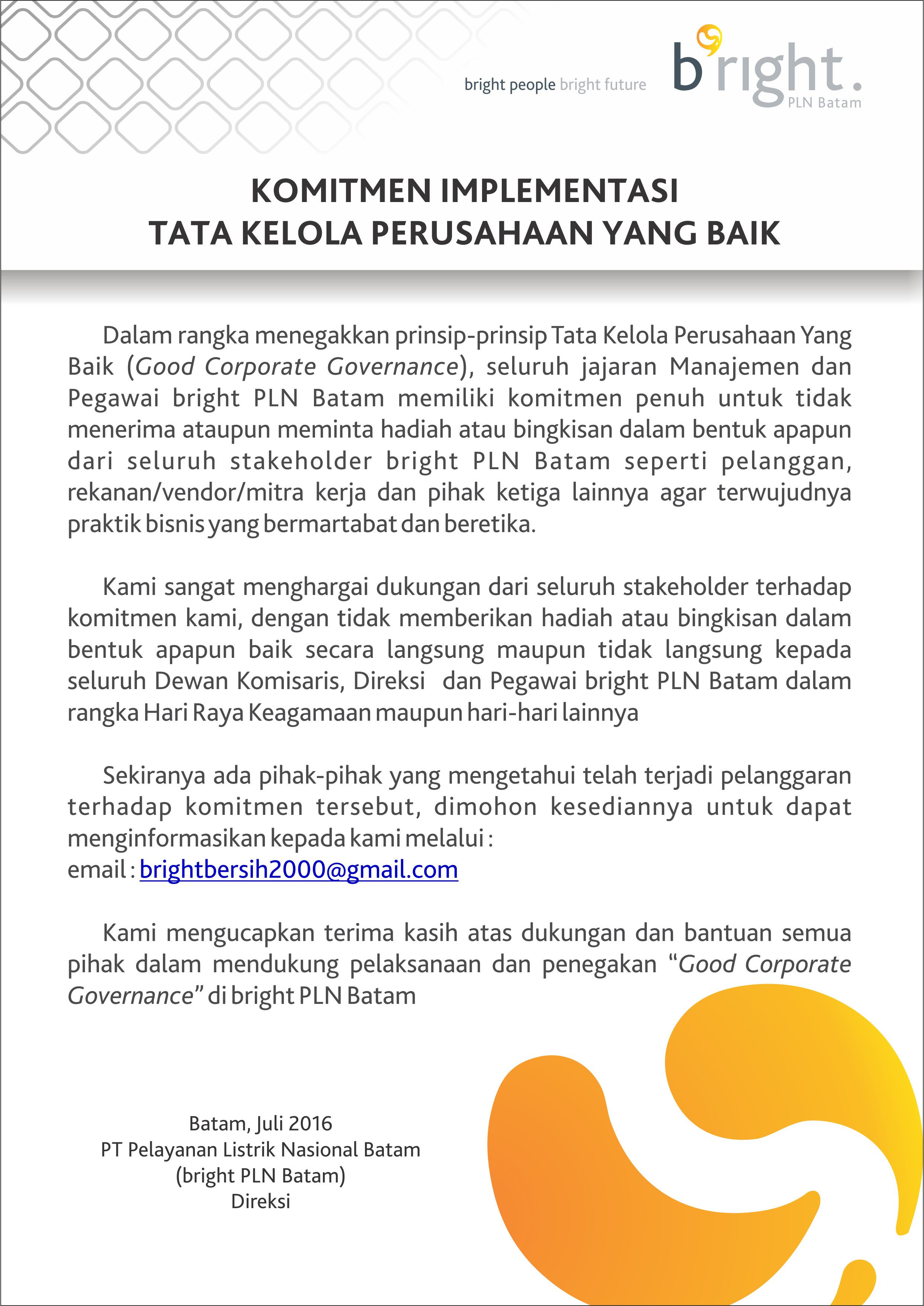 Kami mengucapkan terima kasih atas dukungan dan bantuan semua pihak dalam mendukung pelaksanaan dan penegakan “Good Corporate Governance” di bright PLN Batam