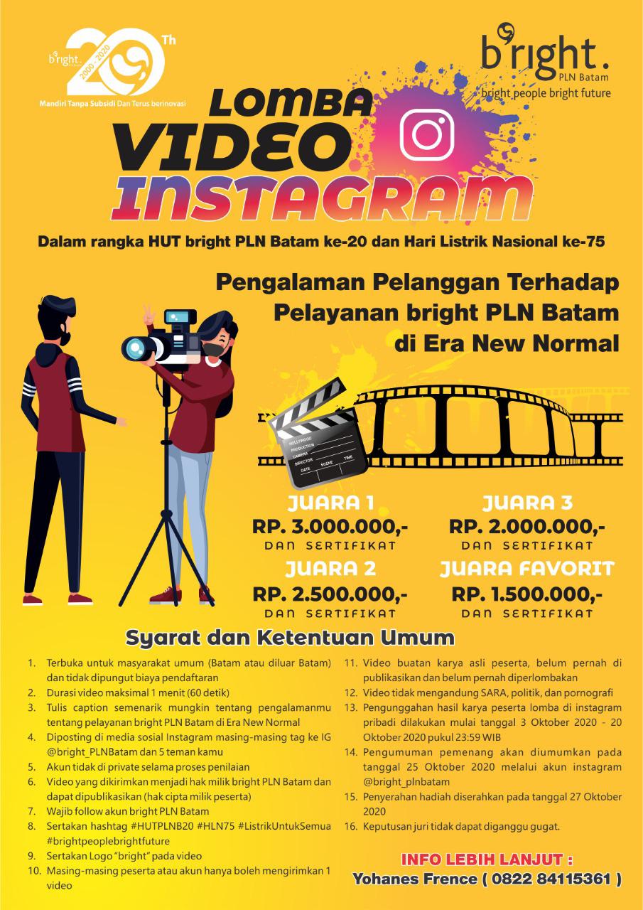 Seperti yang diberitakan sebelumnya bahwa dalam rangka HUT Bright PLN Batam yang jatuh tanggal 3 Oktober 2020 dan Hari Listrik Nasional ke-75 pada tanggal 27 November nanti. Bright PLN Batam menggelar lomba menulis feature khusus Jurnalis dan Lomba Video Instagram.